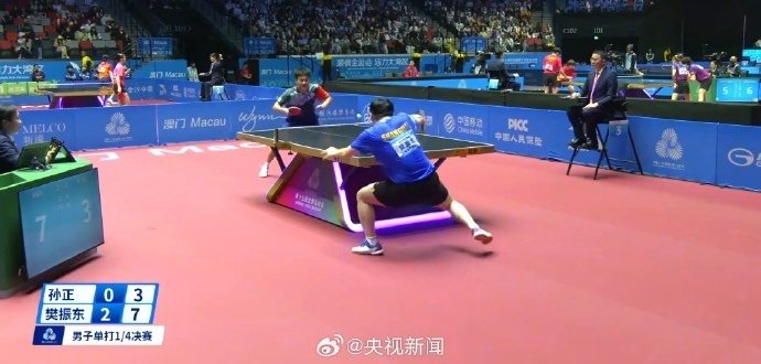 第十五届全运会乒乓球男单1/4决赛,樊振东礼服孙正,晋级4强。