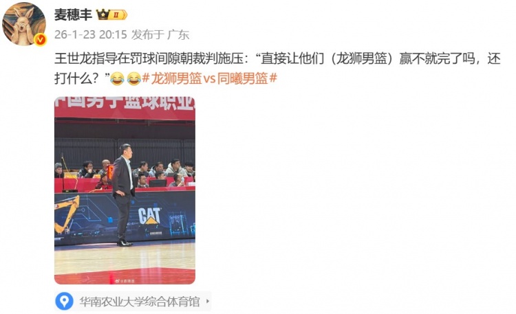 据在现场不雅战的媒体东谈主麦穗丰显现,同曦男篮主磨真金不怕火王世龙在罚球短处朝裁判施压说谈:“胜仗让他们赢不就已矣吗,还打什么?”