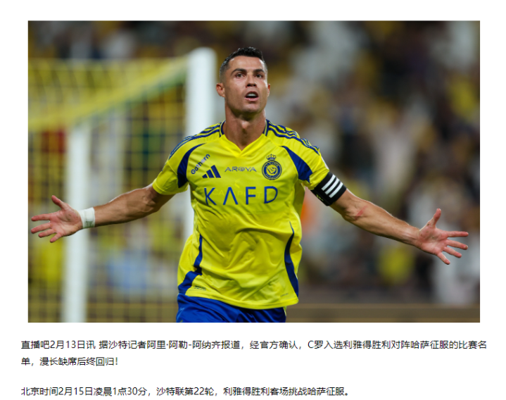 所有这个词尘埃都已落定呀!C罗最终杀青了复出,沙特的记者实真的在地敲定了入选名单,那场罢赛风云彻澈底底地落下帷幕了。 别再臆度啦!关于C罗复出的悬念,最终有了可信的谜底!沙特记者阿里·阿勒 - 阿纳王人进行了官方证据,C罗被选入了利雅得获胜对阵哈萨投诚的比赛名单,在经由漫长缺席后郑重转头,放假遗弃了,球迷早就渴望他能先来献技个帽子戏法弥补进球空白,仅仅外界未免会有疑问:这所说的“放假”,难说念不即是之前闹得沸沸扬扬的罢赛情况吗?这场风云终于落下帷幕,一下子激发了全球球迷们的强烈盘问。 在此之前